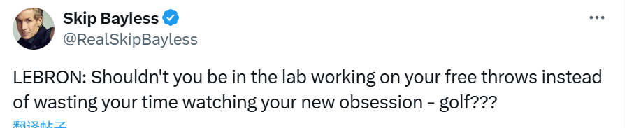 名嘴Skip Bayless在社交媒体吐槽:“勒布朗,你难道不应该在训练馆里练习罚球,而不是把时间浪费在你新迷上的高尔夫上吗???”